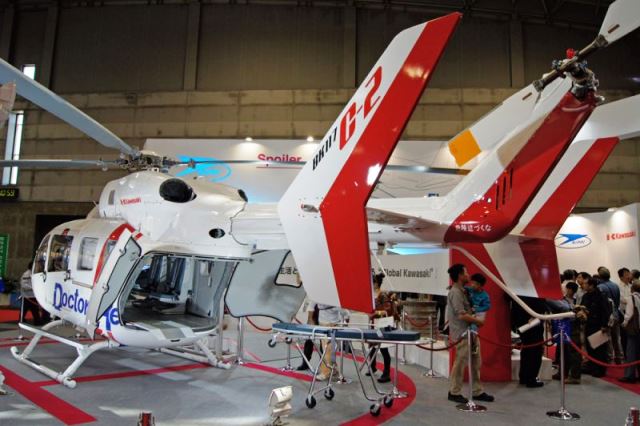 ドクターヘリ仕様ですが、新造機でまだ引き渡し先が決まってないとのことでレジも入ってません。このようなピカピカの出来立てを展示するとはさすがです。納入前に機体が傷つかないか心配です。一般の入場者ってこういうのを見るとすぐ機体をポンポン叩いて回るんですよね。