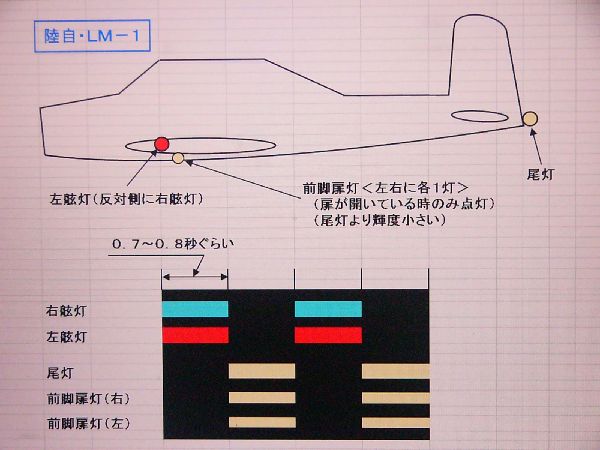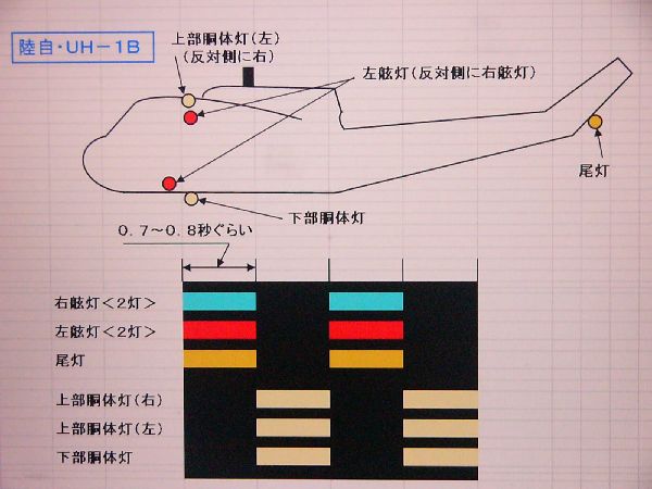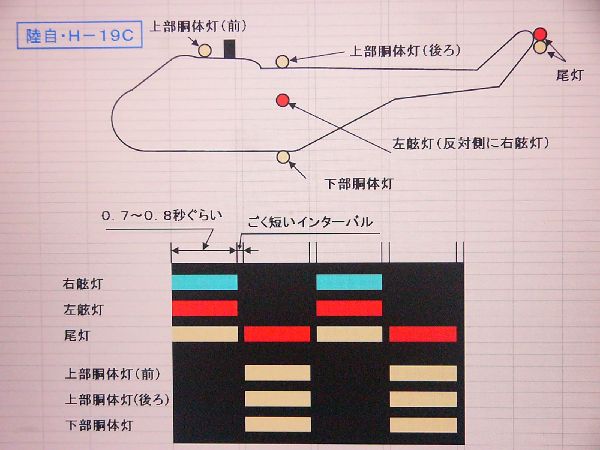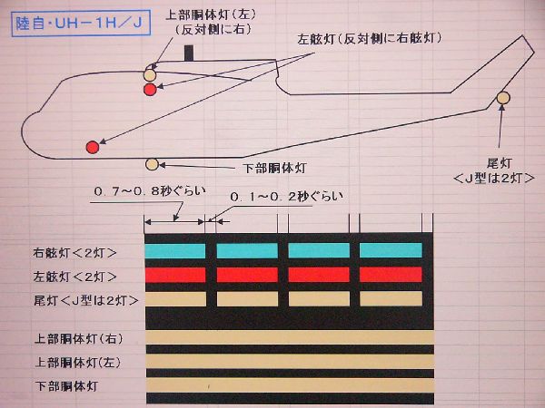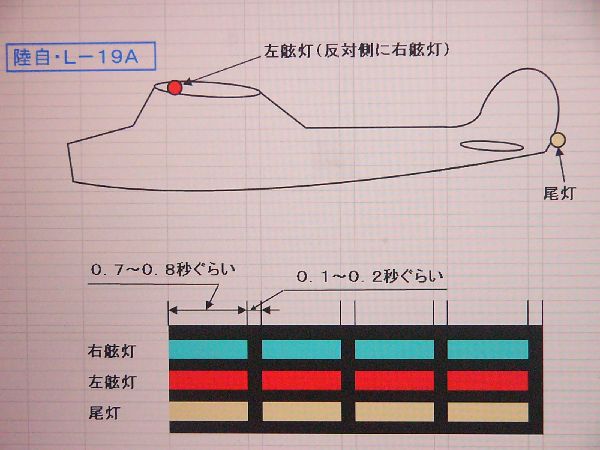 陸上自衛隊霞目駐屯地の近くに住んでいる関係で、幼少のころから陸自機は近い存在でした。その幼少のころに見た初期世代の機体、L−19A、LM−1、H−19Cは衝突防止灯を装備していなかったためか、ナビゲーションライトを、今の不動光とはちがい、点滅させていました。その点滅のしかたが、機種により様々でした。記憶をたどって図面でで説明します。