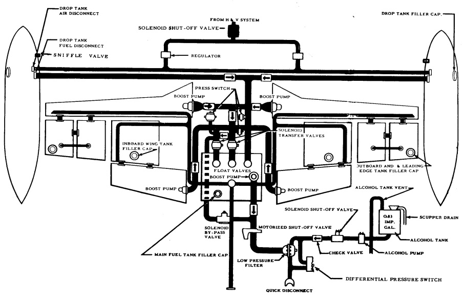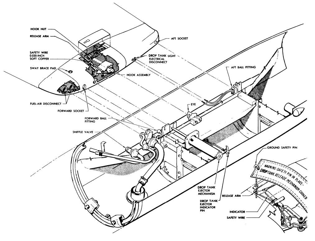ドロップタンクは切り離せるように主翼内を別系統で接続されています。 また、ドロップタンク内の燃料を胴体側に送るためにタンク内に圧縮された空気を送り込むようになっていますね。
