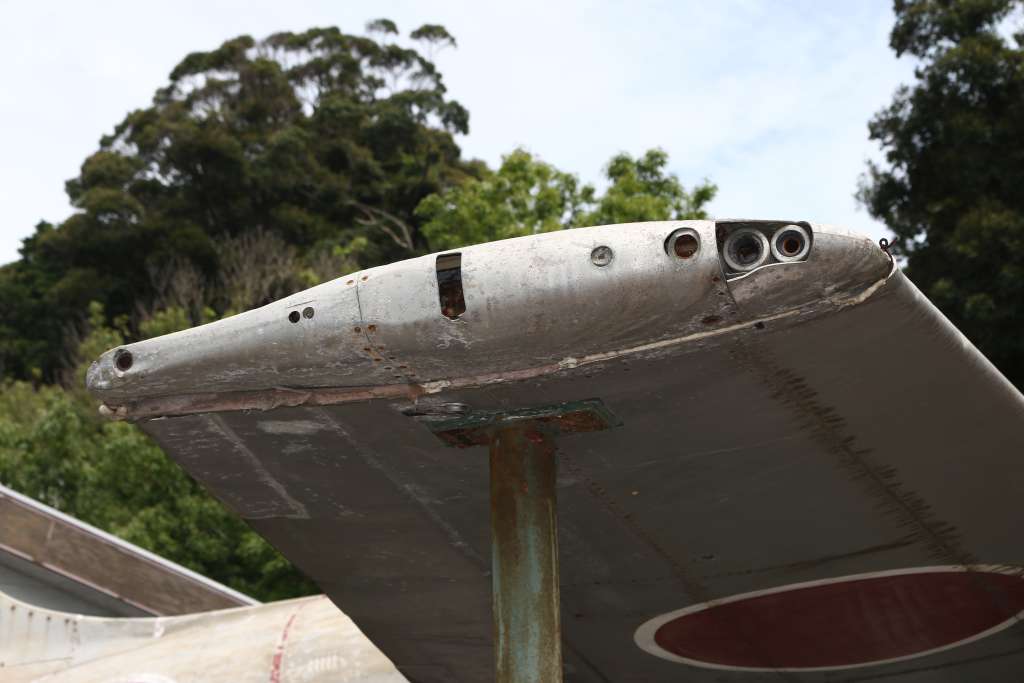「51-5623号機(浜松の喫茶飛行場展示機)の右翼端です。2018年の台風で右翼タンクが落ちてしまったそうですが、おかげで普段は見ることのできない接合部を見ることができました。