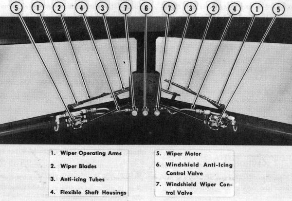 DC-3の場合は、タキシングや滑走中は勿論、運用高度の3000mくらいまでは雨雲もあ るので、飛行中も使用した。アルコールの吹き付は氷結防止のためで、下面から吹き出すと風圧で拡散されワイパーで平均に行き渡 らせる。