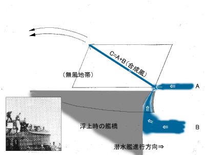 艦橋の上端によだれ掛けのように巻かれているのが、動力なしで自然向かい風を巧妙に利用した装置です。これで限定範囲とはいえ露天艦橋に「無風