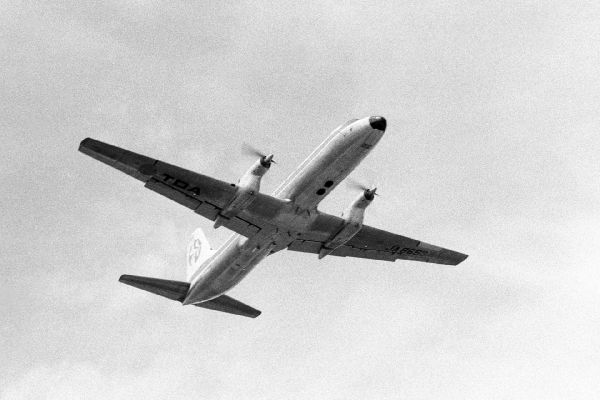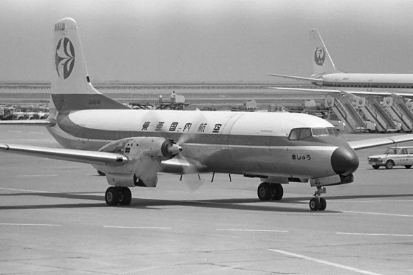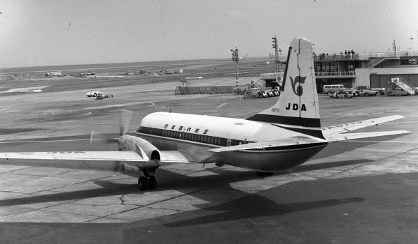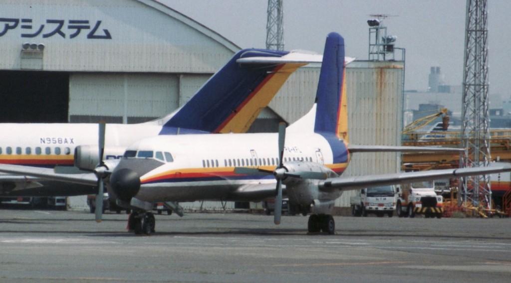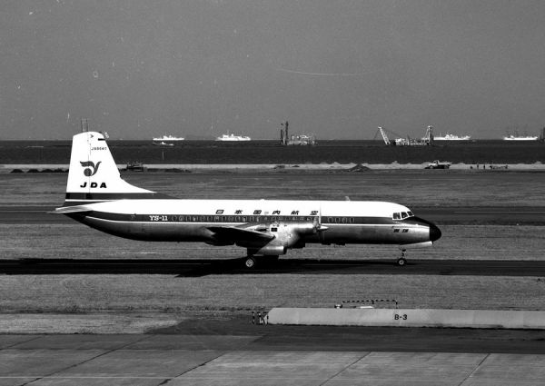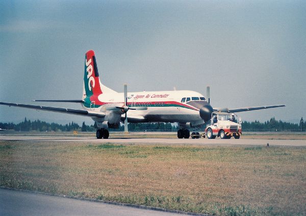 YS-11の路線就航1番乗りをねらう日本国内航空は、量産機の引き渡しを待たずに1965年3月に日航製造と試作2号機のチャーター契約を結び、4月1日から東京-徳島-高知線に就航させました。 同機は、約半年間日本国内航空にリースされ、羽田では日本航空のハンガー前に駐機していました。