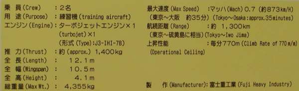 | この4枚は、2005年秋から2006年春にかけて一般に公開された富士T-1Bの説明板です。 共通する項目のみを表に転記してみました。黄色数字は佐伯が換算 | ||||