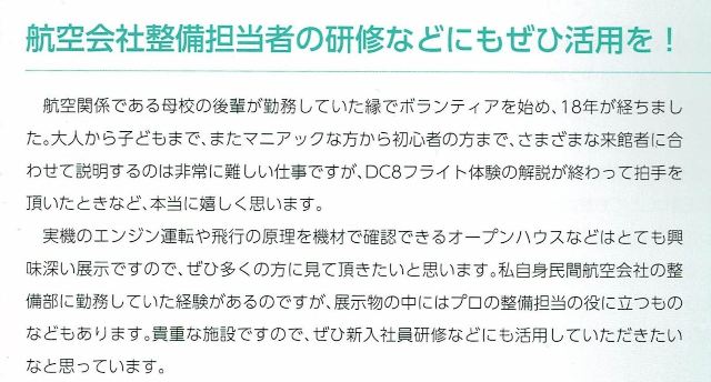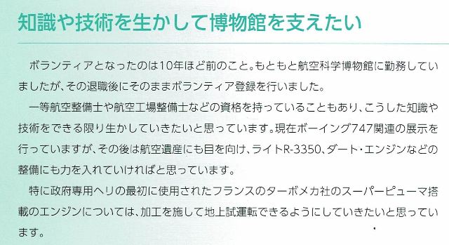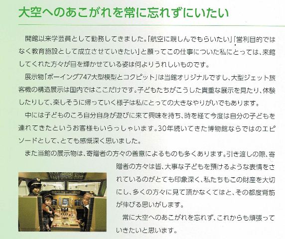 また、つい最近も飛行船展示の写真を送ってもらうなどボランティアの皆さんと同じようにお世話になっている展示部長種山雅夫さんの所感もご覧ください。開館当初から勤務してきた生き字引でとして館が目指してきたところを端的に語っています。