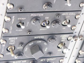 操縦席天井の外部灯火のスイッチパネルです。航法灯は、輝度をBRIGHT(明るい)とDIM(暗い)の2段階選択、また、点灯状態を不動光(STEADY)と点滅(FLASH)とを選択できるようになっています。 輝度調整は編隊飛行等の時使用、また、通常は不動光にするが、衝突防止灯が故障で点灯しないとき、点滅させて衝突防止灯も兼ねるそうです。
