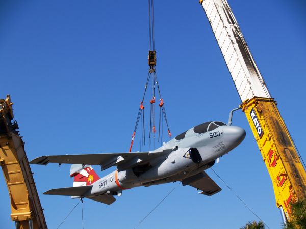 ようやくクレーンで持ち上げ、この機体にとっての『最後の離陸』。公園内の3本の支柱は仮固定でフレキシブル状態。