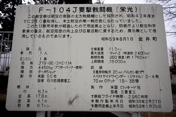F-104J 46-8573の経歴 1964/02/27 三菱製 c/n3037 航空自衛隊へ引渡 1984/01/25 用途廃止 説明板の表示 撮影 笠巻敏勇 1984/08/01 金井町運動公園へ展示