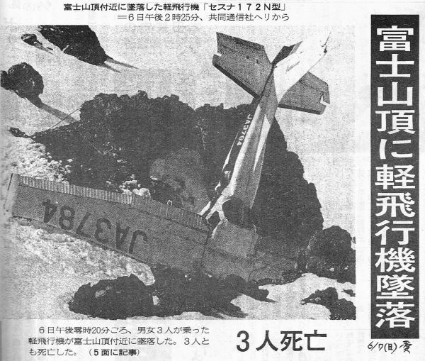 セスナ式172Nラム型JA3784は、平成4年6月6日、レジャー飛行のため富士山頂付近を飛行中、12時20分ごろ、静岡県富士宮市の富士山頂火口に墜落した。 同機には機長ほか同乗者2名計3名が搭乗していたが、全員死亡した。