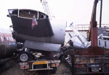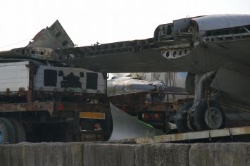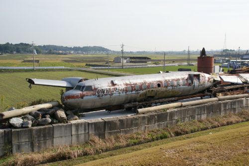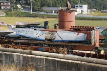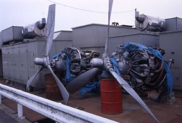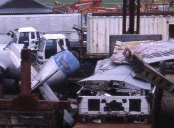 の姿を見つけることができます。資材置き場で川の堤防に面しており、国道からも見ることができる場所にあります。 CV−240およびライアン・ナビオンとも、1年前の浦田さんの撮影当時と特に変化があるようには見受けられませんでした。 ただ、堤防側とは反対の入口側に、道に面してCV−240のものであろうエンジンが2基、プロペラ付きで展示されていました。オーナーが趣味で飾っているのか、この店の目玉商品としての展示なのかはわかりません。(休日で事務所は閉まっていました)