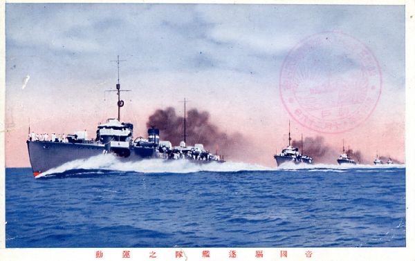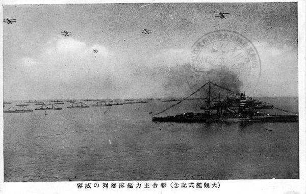 以下、昭和3年12月4日横浜沖で挙行された御大礼特別観艦式の写真を使用したものと思われます 飛行機は、新鋭の一四式水上偵察機の編隊か |
