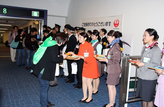 最終日となった3月30日は、朝の熊本便からお別れを惜しむ航空ファンが搭乗、1801便熊本空港到着時には消防車による放水アーチの歓迎があるなど各地でセレモニーが行われました。最後の就航地となる広島空港には多くの航空ファンが詰め掛けましたが、名残を惜しむ乗客の記念撮影などで1613便の広島到着は25分ディレイの19:25。