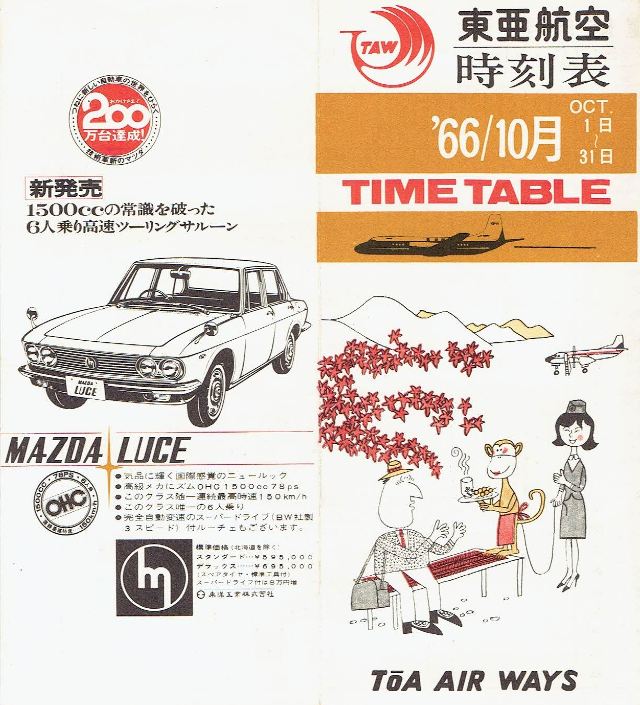 1962年 後半期の発行と推定される時刻表 1962年秋東亜航空へのリース時代のイラスト 社名の文字のみを変更していた 帯は藤田航空の赤 イラスト佐伯邦昭