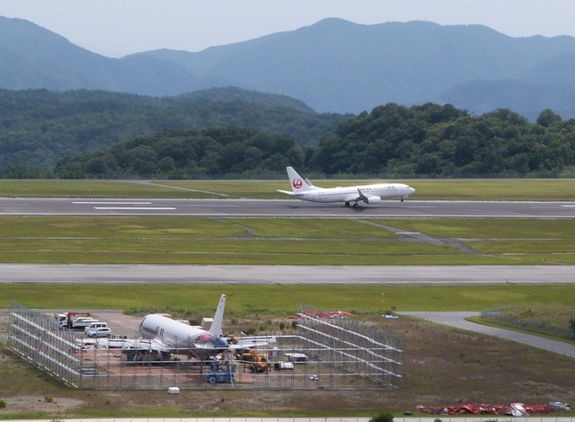 解体したエンジンなど部品と切断破壊したスクラップは、航空貨物用のコンテナに収納され、広島〜仁川の同社定期便に積んで順次仁川空港へ搬送されました。臨時置場は、7月24日夕刻に片づけが終わった模様です。