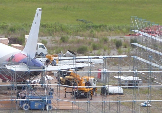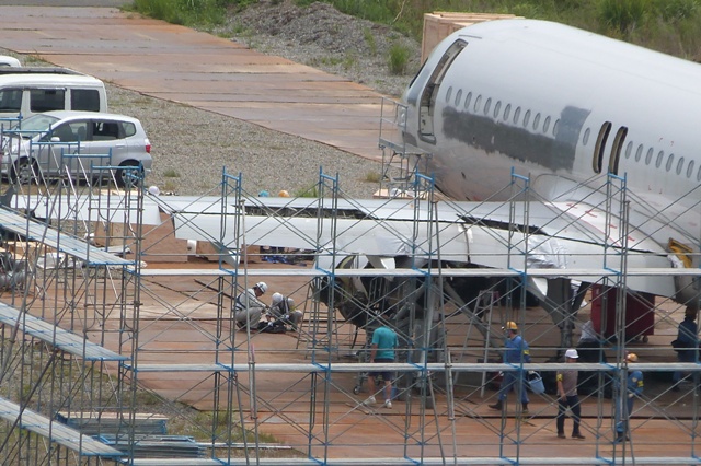 4月25日、日本航空の支援で燃料を抜き取り、同日深夜、飛行場西側空き地に台車移動しました。
