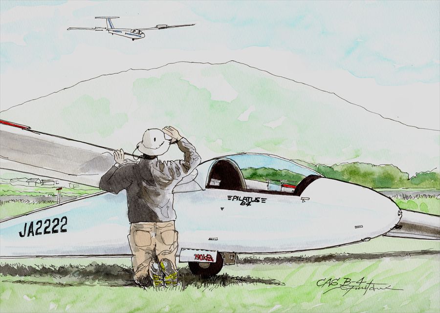 中国航空協会のピラタスB4の横で着陸するブラニクL-23を見上げる会員